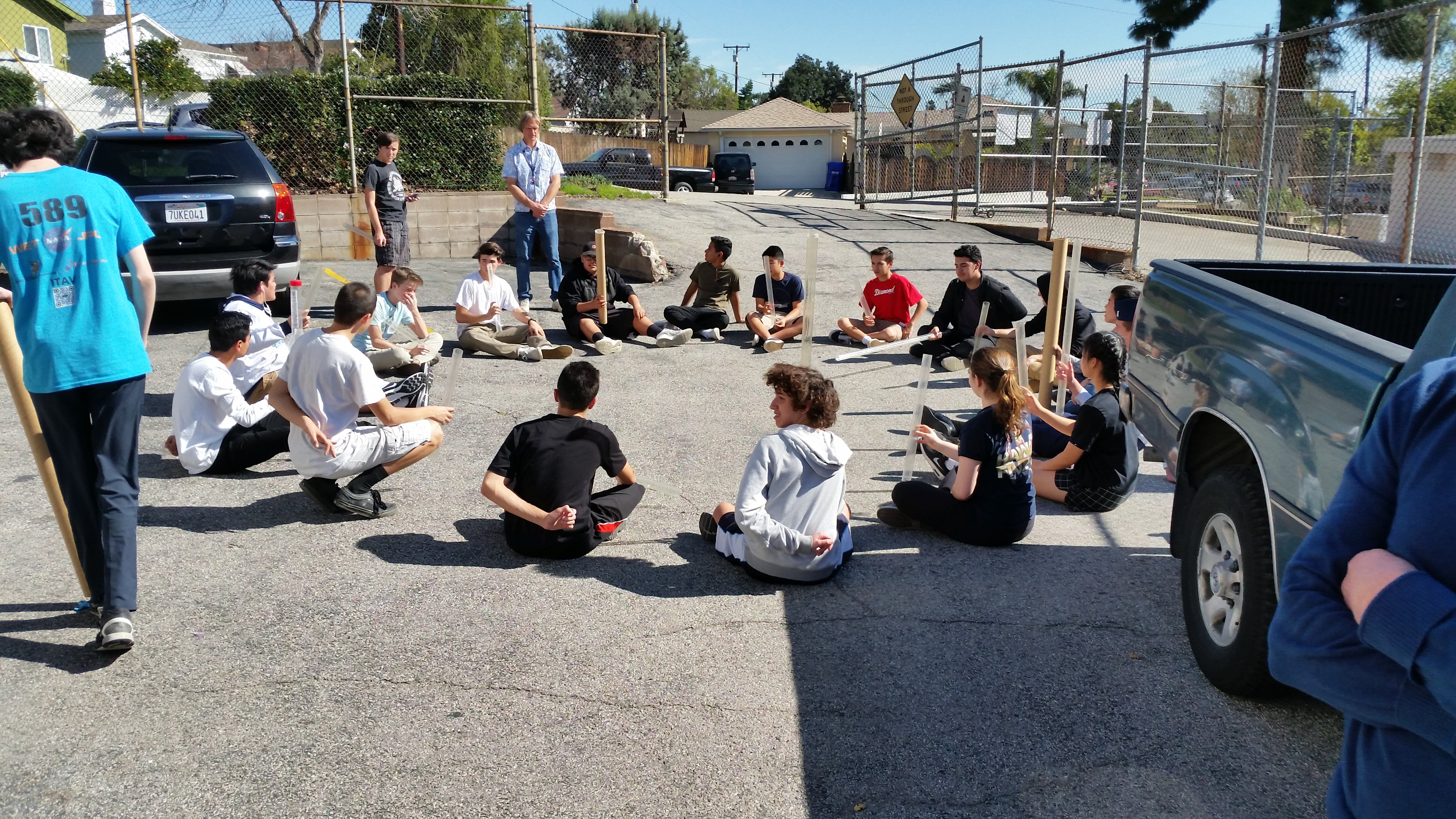 Today we had a wednesday challenge where we had to toss plastic pipe tubes a circle with out dropping it and if we did it sitting standing and standing skipping a person we would win.